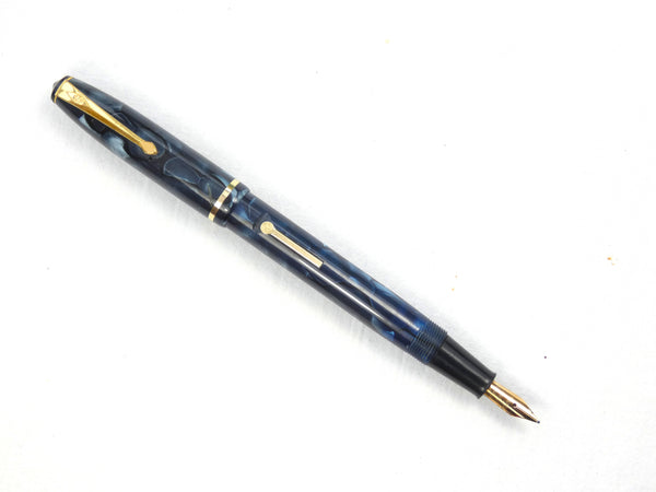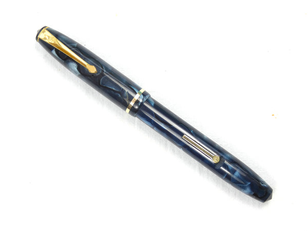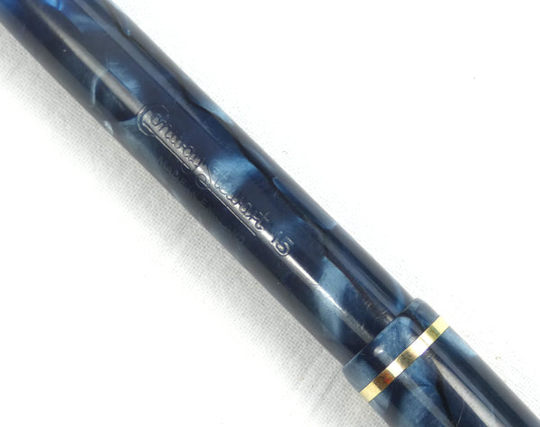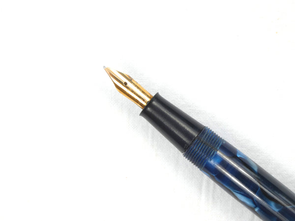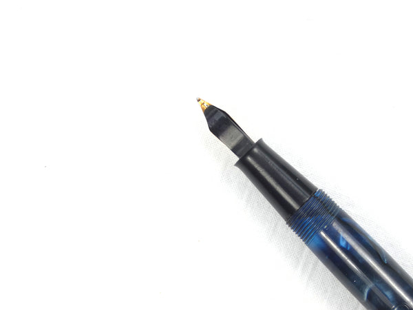 Attractively finished in marbled blue with black veins, the pen is in superb condition throughout. The colour is bright and has first class finish with a clear barrel imprint. The gold filling to the clip and lever is similarly pristine.