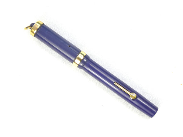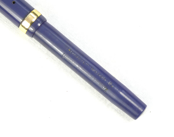 The pen has been restored and tested and is in good working condition. It is finished in blue, perhaps a little faded, but it has a good surface and the imprint is particularly strong. The gold filling to the cap bands and the lever has held up very well.