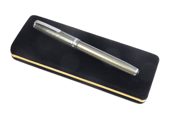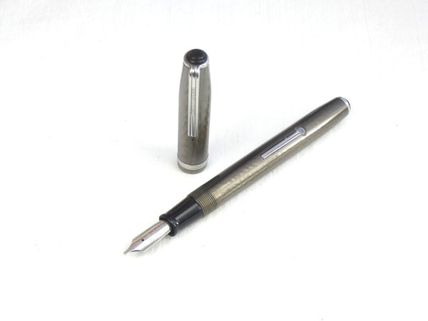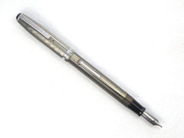 The pen is finished in 'Pearl Grey', some batches were a darker colour, 'Dawn Grey', this is one of the much brighter pens. It has an excellent surface and a clear barrel imprint. The 'double grooved design of the clip is carried through to the cap band and the filler lever, all in good condition. It is a 'double jewelled' pen, with a black stud at the barrel and cap ends.