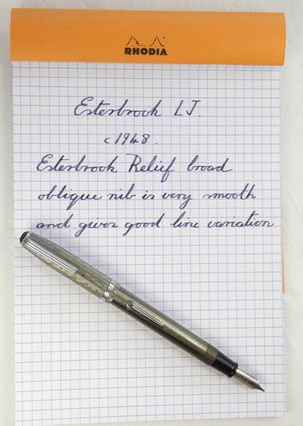A new ink sac has been fitted, as the old one had hardened with age, and the pen has been serviced and tested. The nib is horizontally engraved 'Esterbrook 2514-B'. Relief. Broad' Esterbrook listed the 2514-B nib as a 'Relief broad oblique'', I found it to be very smooth writer which offered line variation 'naturally' without the changes in pressure needed by a flexible nib.