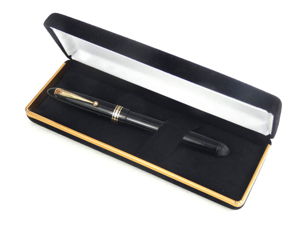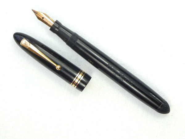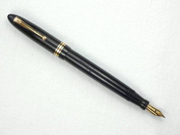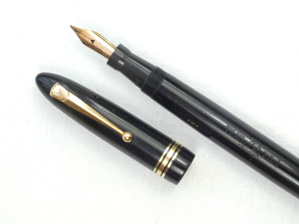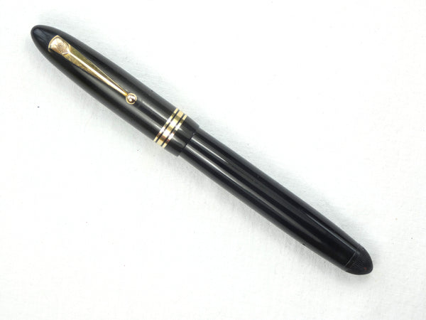 This is an outstanding example, finished in black with Gold filled clip and triple cap band. The surface is excellent, the barrel imprint is crisp and clear, and the gold filling has held up very well.