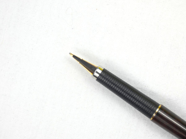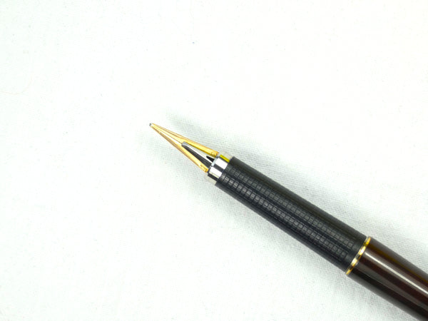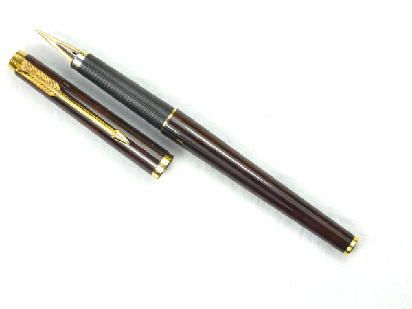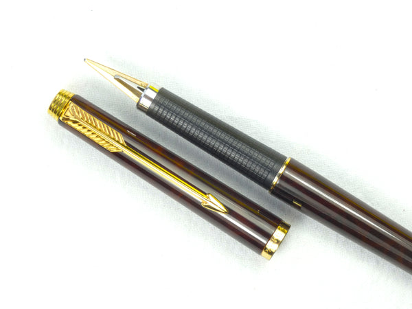 The 'thuya' colour was a replacement for both the 'tortoiseshell' and the 'woodgrain' finishes used on the earlier Parker 75.  The name is taken from the thuya tree, wood is usually taken from the root. The Gold filled 'stack of coins' cap stud also seems to have been 'borrowed' from the 75.  The deep lacqered, multi layer surface is in excellent condition and the gold filling, also pristine, appears deeper and more richly coloured than usual, it may be 18Ct.  A useful feature of the 180 is the flared band at the end of the barrel.  This 'clicks' into the cap when the cap is posted to prevent the rim of the cap making contact with, and scratching, the barrel when the pen is in use.
