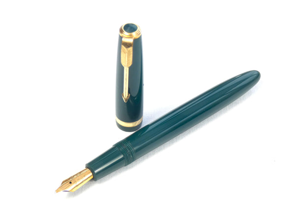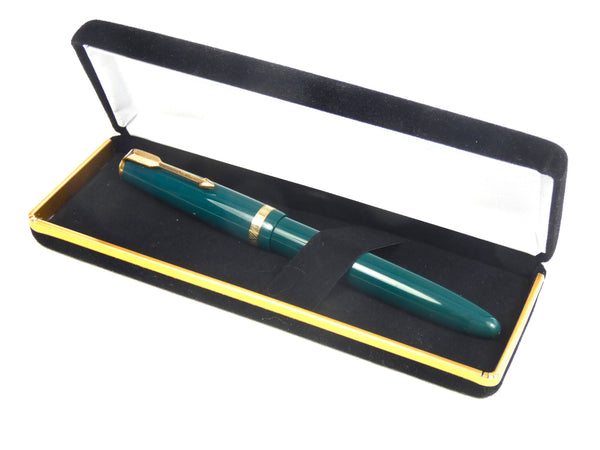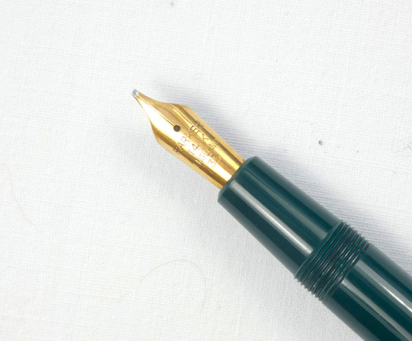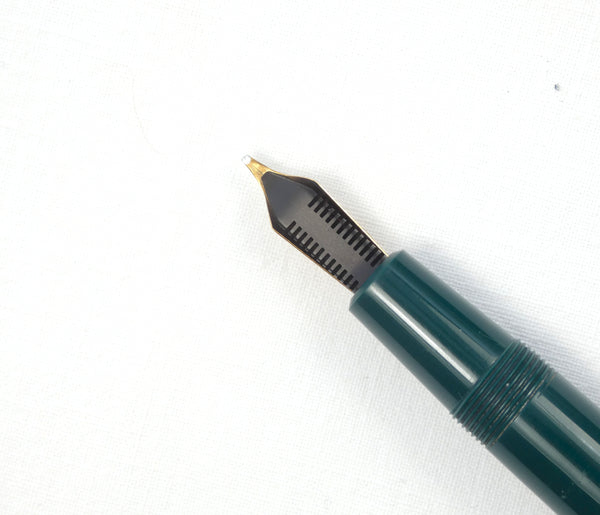 The pen is finished in Green with a Gold filled, chevron engraved cap band and Gold filled clip. It is in excellent condition with a showroom finish and the gold filling has held up very well. The cap is a smooth screw fit, it tightens securely with one and a quarter turns and carries a Green cap jewel.
