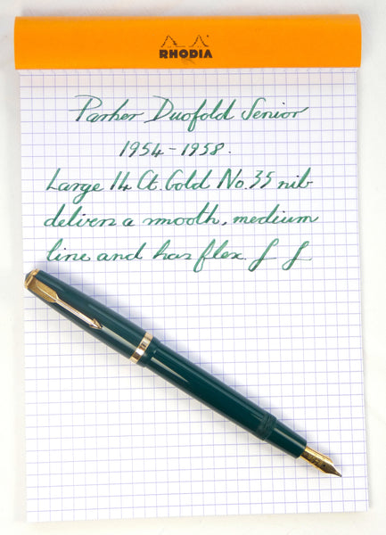 The pen has been fully serviced and tested. The aerometric filling system is easy to use and works well. The correct 14Ct. Gold No. 35 nib, is larger than the standard Duofold nib and writes with a smooth, medium line and has a slightly 'soft' action giving a little flex and line width variation.