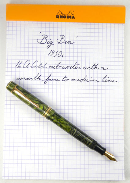 At 16cm. posted this is a large, handsome pen, the finish is described as 'Paintbrush Green', a unique Big Ben colour. The clip, bearing the Big Ben name is heavily gold plated.