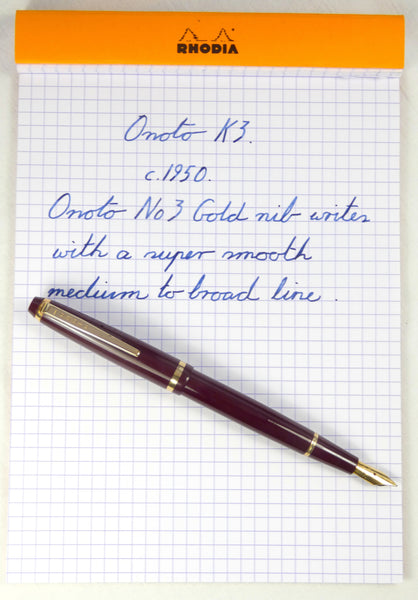The Onoto No. 3. 14Ct. gold nib delivers a very smooth line, perhaps a little on the broad side of medium. At 15 cm. in length when posted, it is a good sized, slim pen with a comfortable, well balanced feel.