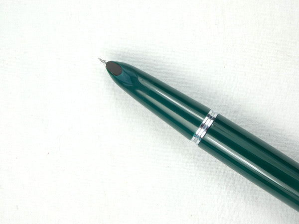 Finished in green, one of the more hard to find colours, the pen is in 'as new' condition with no signs of use. It has a factory finish and a clear, unstained origina 'pli-glass' ink sac.