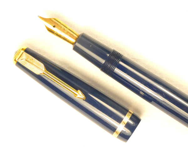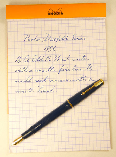 The pen has been fully serviced and tested.  The aerometric filling system is easy to use and works well.  The correct 14Ct. Gold No. 35 nib is large and impressive, it has a fine point and delivers a smooth fine line with the pleasing 'soft' feel that Parker achieved so well, even with a fine nib.