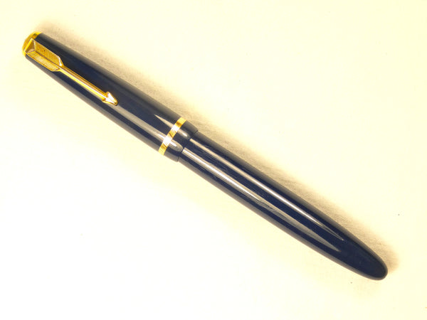 The Parker Duofold Senior was added to the U.K. Duofold aerometric line in 1954, a year after the first aerometrics, the 'Standard' and the 'Demi'.  The Senior was the largest of the U.K. Duofolds at the time, production ceased in 1958.  This particularly fine example carries a date code for the first quarter of 1956.