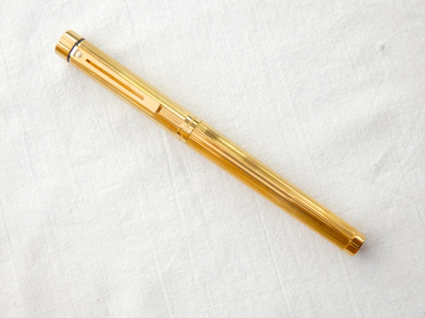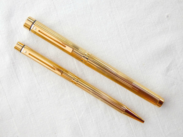 The Sheaffer Targa 1005, introduced in 1976, is constructed in brass with a deep cut fluted pattern in 23Ct. Gold electroplate. It is a full sized 'Classic' pen, the slim version is the 1005s. The original box sleeve does not have a barcode. As these were in common use in the 1980s the set is likely to be an early one.
