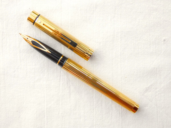 It has the 14Ct. Gold 'inlaid diamond' nib with a fine point. These nibs were made 'from scratch' by Sheaffer, starting with ingots of 24Ct. Gold, copper and silver which were mixed to conform to the 14 Ct. standard.