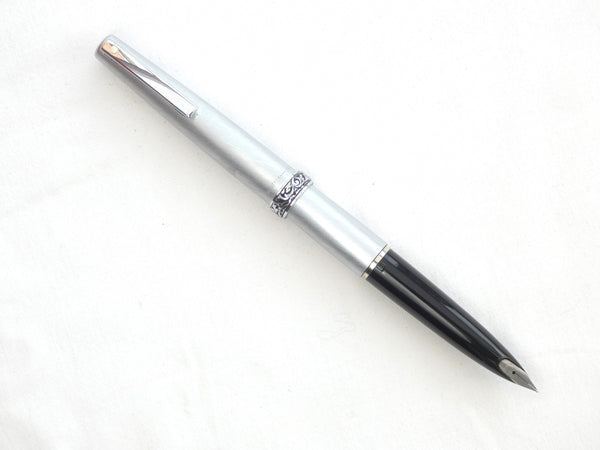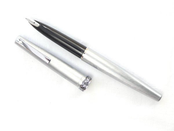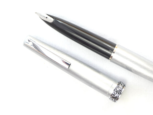 The pen is of brushed steel construction with a Chrome plated clip which carries the Sheaffer 'white Dot' mark of quality. The cap is finished with an ornate 'Florentine' cap band in polished Chrome and has an inset 'Stylpoint' nib with a medium point. a new Sheaffer ink cartridge is included so the pen is ready to write.