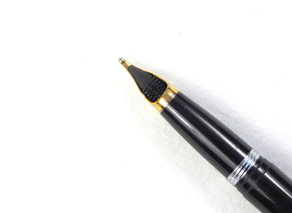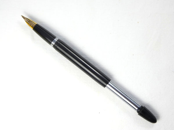 The touchdown filling system takes up a good volume of ink with one operation of the plunger and the unusual unmarked 9Ct. Gold short cylindrical nib writes with a wonderfully smooth extra broad line, well suited to someone who likes to write 'with a flourish'. The upturned nib, which has a generous ball of tipping, was designed to maximise contact with the paper for a smooth writing experience.