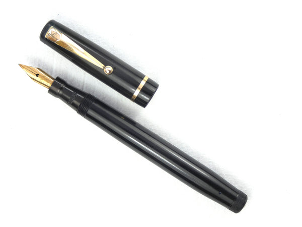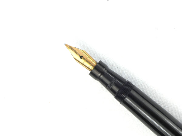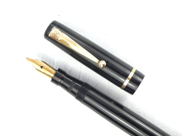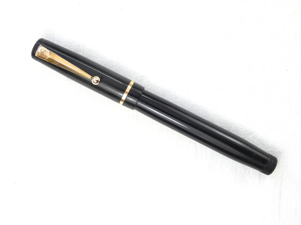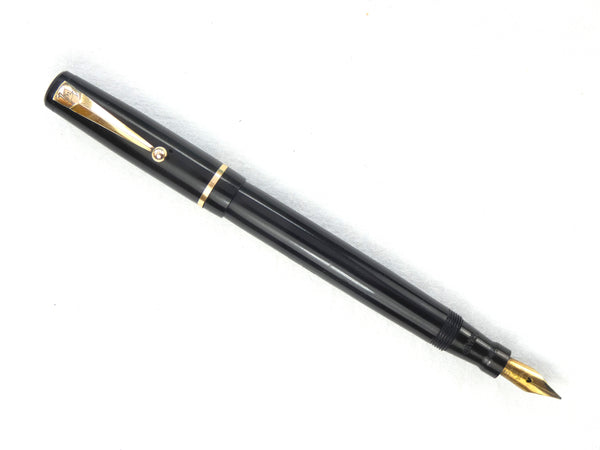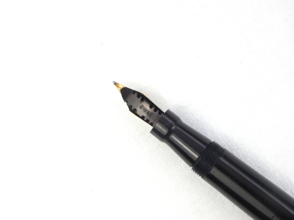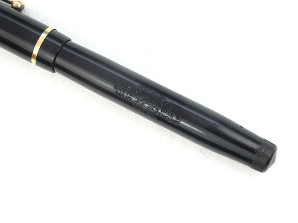 The pen is finished in black with Gold filled trim. It is in excellent condition throughout with a good surface and a very clear imprint. The filler button and cap stud are hard rubber and, unusually, show no brown patina. The pen is a 'flat top', with a Swan 'medallion' inset into the cap stud.