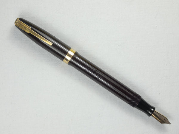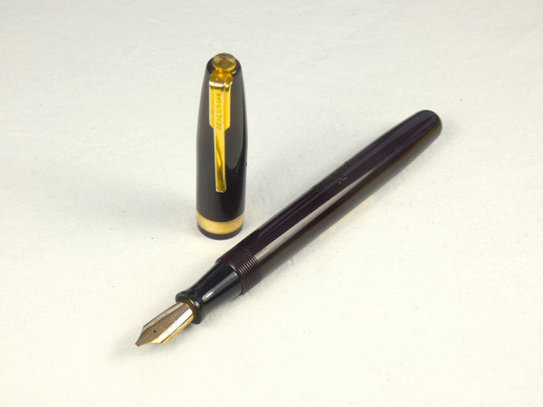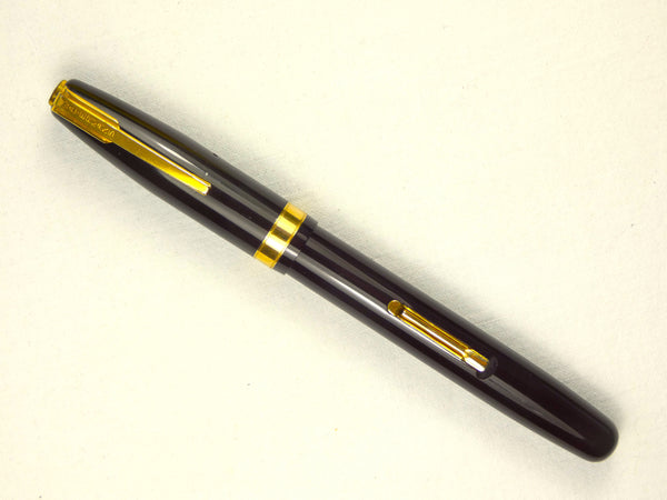 Finished in a most attractive and unusual brown color, more pronounced than it appears in the photographs, the pen has been fully restored and tested and is in excellent condition throughout. The surface is first class with a strong imprint and the Gold filling is similarly pristine.